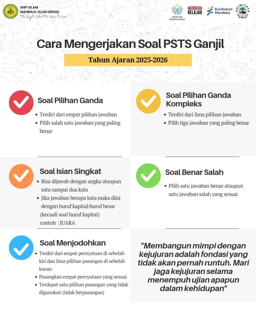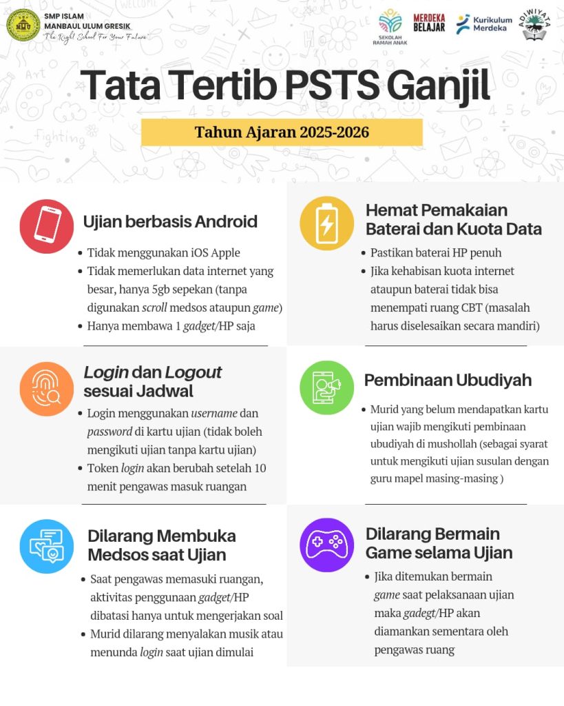 Gresik, 2025 – SMP Islam Manbaul Ulum Gresik resmi melaksanakan Penilaian Sumatif Tengah Semester (PSTS) Ganjil Tahun Ajaran 2025/2026 dengan sistem Computer Based Test (CBT) berbasis Android.